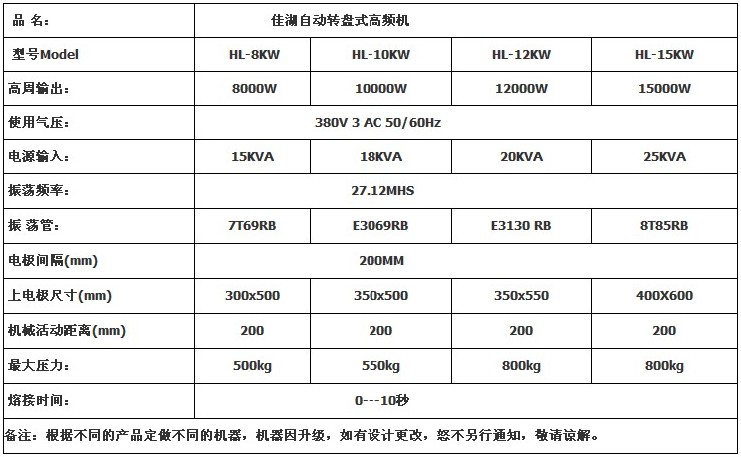 1、多工位自動轉盤式高頻機有3~8工位,有標準型和PLC微電腦控制,多款機械根據客戶需求選擇供率大小,可根據客戶要求加裝熔斷功能,臺面大小,熔接次數,工位數選擇,自動放料系統和自動機械手自動取料等。