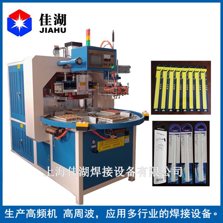 1.高周波自動轉盤式高周波機的用途:利用高頻熱合的原理,通過高周波模具加熱工件,到達塑料同塑料的熔接、塑膠同紙卡,或紙卡同紙卡的塑接,被熔接的紙卡通常在印刷時表面被涂上一層PVC或APET、PETG的膠水,在高周波的作用下熔為一體。