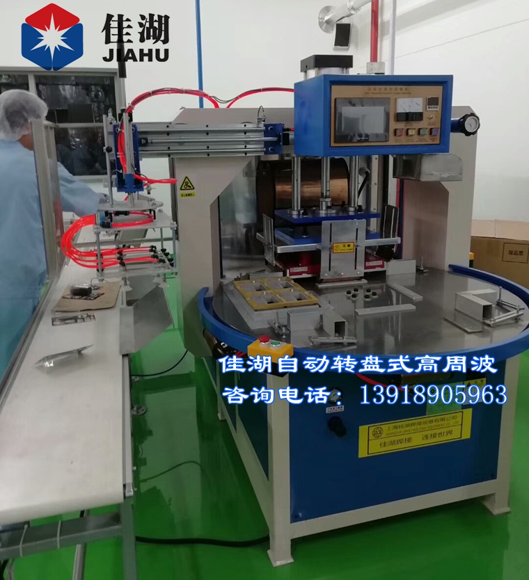 其實高周波和高頻機,高周波機,高周波熔接機,高周波塑膠熔接機,高頻熱合機是同一種機器設備,只是設備款式和型號不同,高頻機主要是用在塑膠熔接,PVC、PET、PETG、PU皮革,吸塑包裝,吸塑和紙卡包裝貼合,PVC軟膠袋,PETG吸塑泡殼封口、吸塑紙板封口、汽車座墊,汽車商標,汽車地墊腳墊,暖水袋,電池包裝封口,U盤吊卡吸塑包裝封口、吸塑泡殼封口、PVC塑料泡殼封口、PVC泡殼焊接、PVC塑料泡殼焊接、高頻塑料焊接、高周波塑膠封口、雙面泡殼封口、電池吸塑吊卡包裝封口、五金工具封口、雙面泡殼封口、PVC雙面泡罩封口、雙面紙板泡殼封口、紙板泡罩封口、塑膠塑料熱合焊接等:具體高頻機可壓的產品歡迎咨詢上海佳湖焊接設備公司.以下是自動轉盤式高頻機設備。