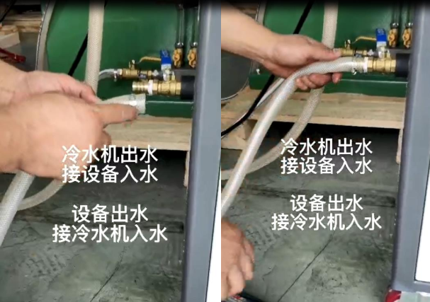 2、在接冷水機出入水,入水接通到設備接口處,在接好出水處;冷水機電源為220V在這里提示一下,如是380V三相五線制,三根火線,一根地線,一根零線,冷水機接頭電源后設置冷水溫度,一般溫度設為20°左右;見圖